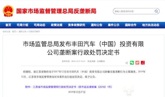 12月27日晚间,国家市场监管总局对丰田轿车(我国)投资有限公司宣布一份处分决议,因其在雷克萨斯品牌轿车出售中违背《反独占法》,涉嫌施行价格独占行为,处以8761.3万元罚款。